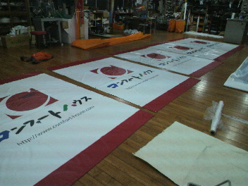 今日は、テント屋さんの工場で、液体ラミネート塗りです。
