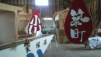 大工さんの作業場で、精霊船のみよしに文字入れ