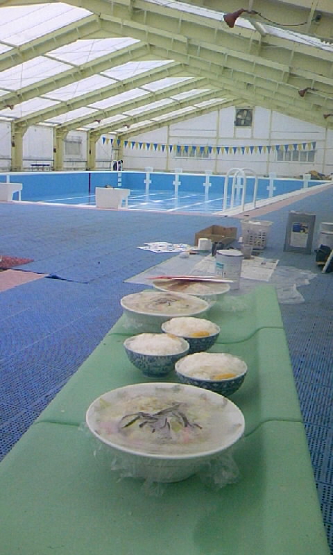その次は、プールの文字書き!プールで作業していて、お昼はどうしようって事になって