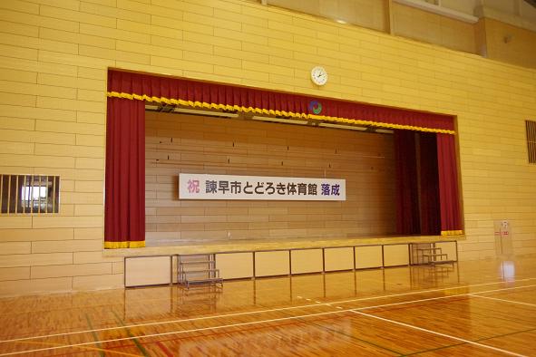 新しく諫早市内に完成した体育館に吊り下げ看板を設置してきました。